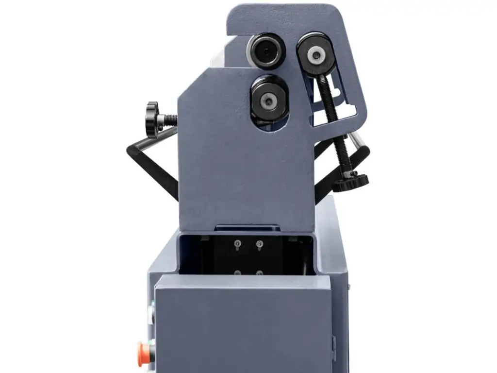 Валки диаметром 90 мм имеют гладкую, полированную поверхность и асимметричное расположение. На поверхности валов есть канавки для гибки прутка. Нижние и боковые валки регулируются вручную по высоте. Верхний валок оснащен поворотно-откидным устройством, зажимом эксцентрикового типа и вращается в обе стороны. Вращение от электродвигателя на валки передается через систему шестерен и цепную передачу. Управление сгибанием осуществляется с помощью выносной ножной педали. За счет массивной, жесткой станины эти вальцы электрические сохраняют стабильность даже при высоких нагрузках.