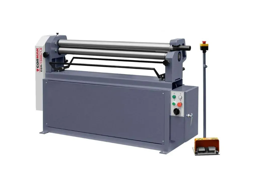 Вальцовочный станок CORMAK ESR-1300/1,5 – это эффективное электромеханическое оборудование для гибки листового металла с целью получения изделий цилиндрической и конической формы. Максимальная толщина листовой стали, с которой может работать станок, составляет 1,5 мм. Максимальная ширина листа – 1300 мм.