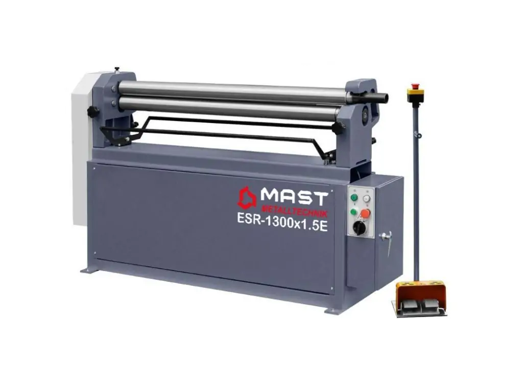 Вальцовочный станок MAST Metalltechnik ESR-1300x1.5E – это электромеханическое трехвалковое оборудование для гибки листового металла в цилиндрические, дугообразные и частично конические формы. Рассчитан на листы толщиной до 1,5 мм и шириной до 1300 мм. Оснащен электродвигателем мощностью 0,75 кВт с редукторной передачей, обеспечивающим стабильный крутящий момент и постоянную скорость вращения. Реверс двигателя позволяет изменять направление вращения валков, что важно для выравнивания листа и вывода заготовки.