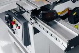 Станок оснащен асинхронным двигателем мощностью 3 кВт/ 4 кВт, который поддерживает стабильный крутящий момент даже при максимальной нагрузке. Каретка изготовлена из алюминиевого профиля и перемещается по закаленным стальным направляющим, что обеспечивает плавность хода и высокую точность раскроя по всей длине. Для повышения точности и удобства резки этот форматный раскроечный станок оборудован параллельной линейкой с микрометрической настройкой и телескопической линейкой с двумя откидными упорами.