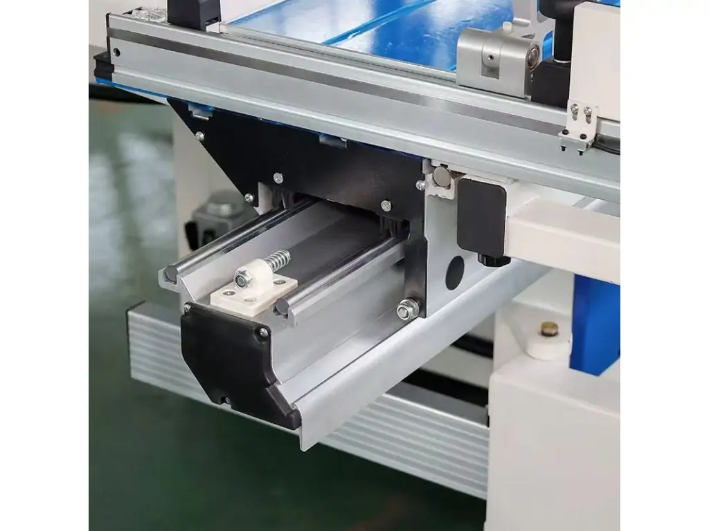 Каретка размером 3200x420 мм со стальными цилиндрическими направляющими и роликами качения большого диаметра обеспечивает плавное и точное движение заготовки во время продольного раскроя. Телескопическая опора и массивные кронштейны креплений сохраняют геометрическую стабильность конструкции и позволяют работать с тяжелыми листами без потери точности и качества раскроя. Благодаря массивной чугунной станине, пильному узлу из серого чугуна и системе смазки направляющих основной пилы этот форматно-раскроечный станок с электронным управлением остается точным, стабильным, надежным и безотказным на долгие годы.