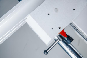 Максимальный диаметр пильного диска составляет 350 мм. Наклон пильного диска от 0° до 45° позволяет точно выполнять угловые пропилы. Максимальная высота пропила (0°/45°) - 110/70 мм. Алюминиевая каретка имеет размер 3200х400 мм и перемещается на 2 стальных роликах по круглым направляющим диаметром 16 мм. Этот форматно-раскроечный станок с подрезным узлом обеспечивает длину пропила до 3100 мм и высокую производительность работы, что делает его идеальным выбором для серийного производства.