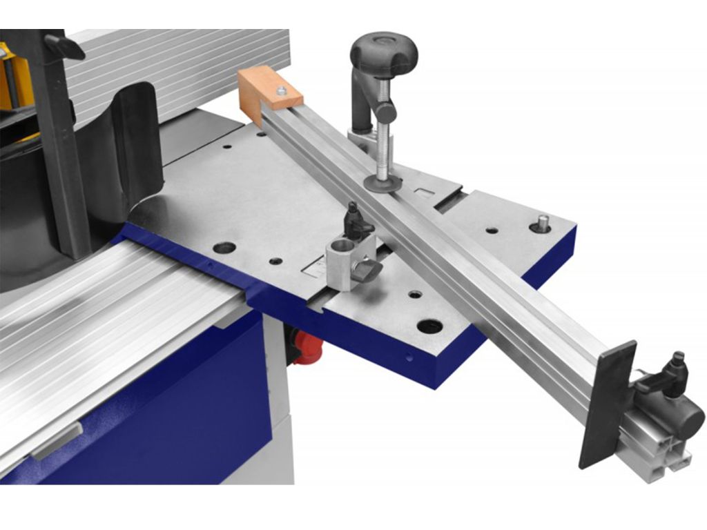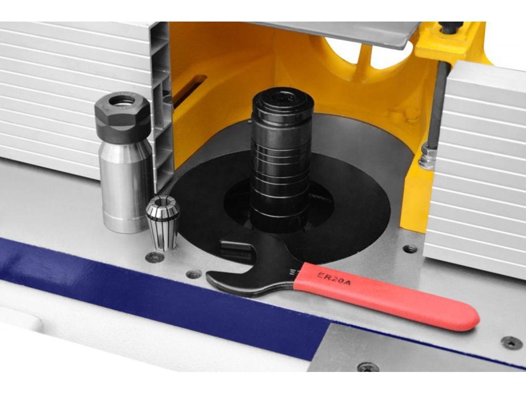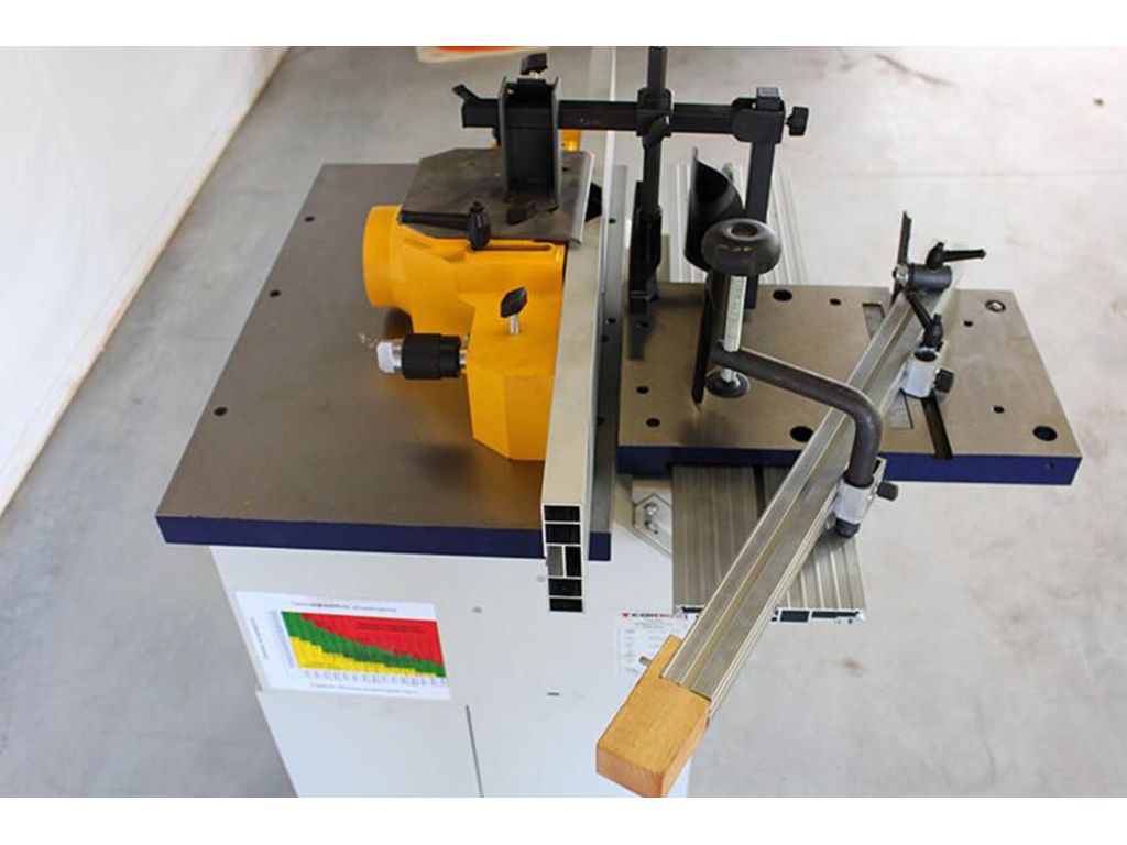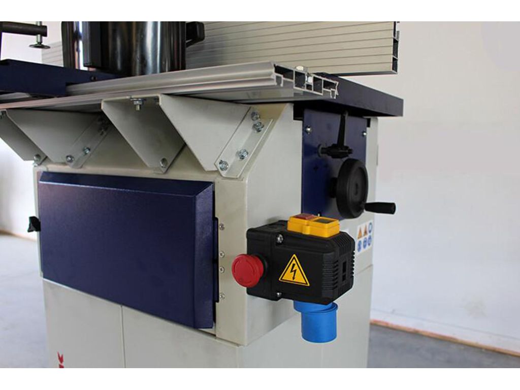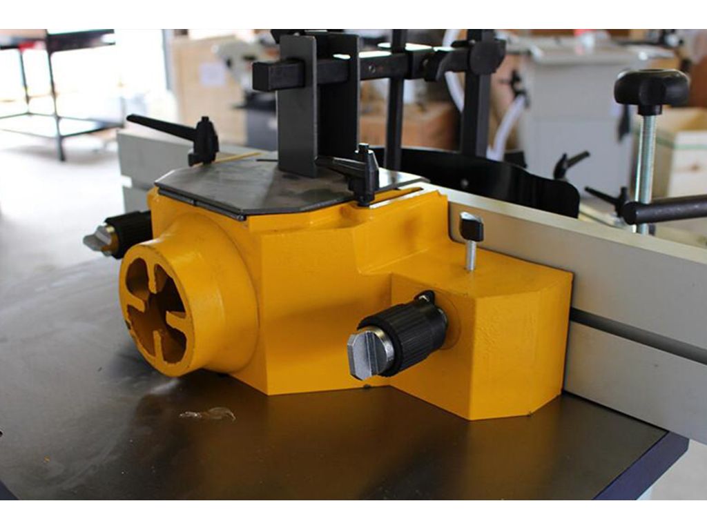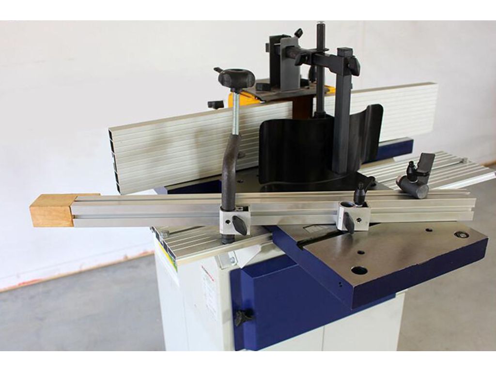 Выдвижной шпиндель 30 мм вращается со скоростью 6500 об/мин в верхней части корпуса находится механизм поддреживающий обрабатываемый материал. Станок идеален, как для профессионалов так и столяров аматоров.