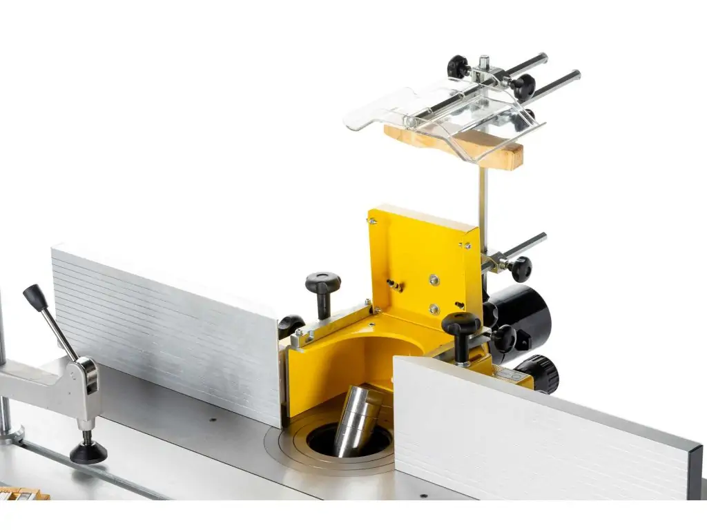 Станок оснащен высококачественной алюминиевой мобильной шипорезной кареткой шириной 310 мм. Массивная чугунная станина обеспечивает стабильность работы и не подвержена перекосам. Еще одним весомым преимуществом является встроенная аспирационная установка. Также есть выход под дополнительную аспирацию. Оборудование отвечает европейским стандартам качества и безопасности.