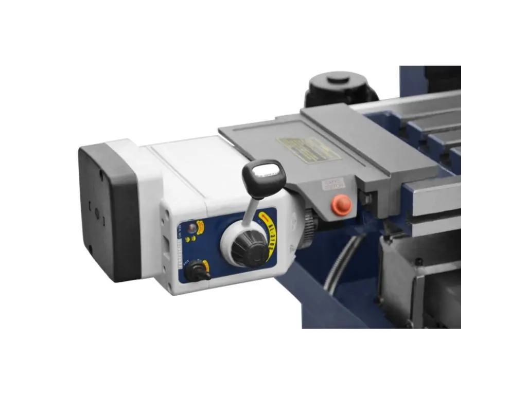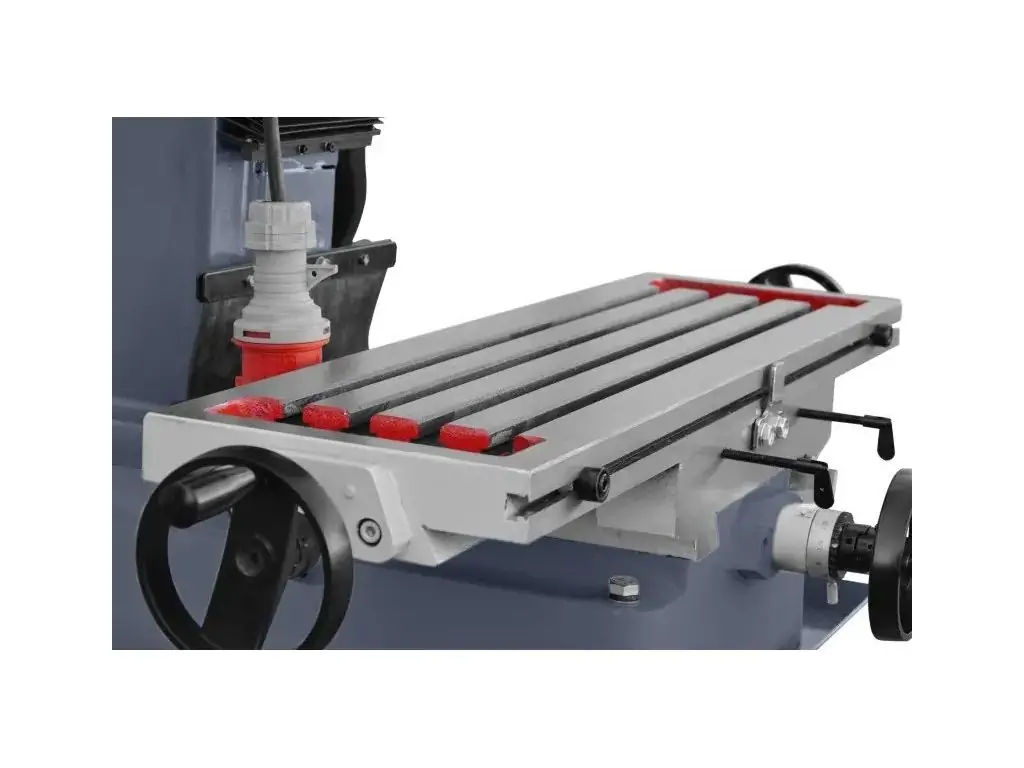 Конус шпинделя МК4 обеспечивает надежное крепление и точную центровку инструментов. Передача крутящего момента от двигателя к шпинделю осуществляется через редуктор, что позволяет эффективно работать с твердыми металлами и большими диаметрами фрез без потери мощности. 6 скоростей вращения шпинделя (95, 170, 280, 540, 960, 1600 об/мин) позволяют настроить оптимальный режим обработки, а наклон головки на 90° в обе стороны дает возможность обработки под углом. Также этот станок сверлильно-фрезерный оснащен механизмом тонкой подачи шпинделя, что повышает точность обработки.