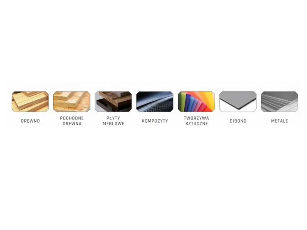 Древесина любых пород, плитные материалы на древесной основе (ДСП, ДВП, МДФ, фанера и т.п.), композитные материалы ("Alucobond", "Dibond", любые полистиролы (в том числе ПВХ и полистиролы с поликарбонатом), гетинакс, искусственный камень , цветной металл, акриловое стекло и оргстекло, модельный пластик и т.д.