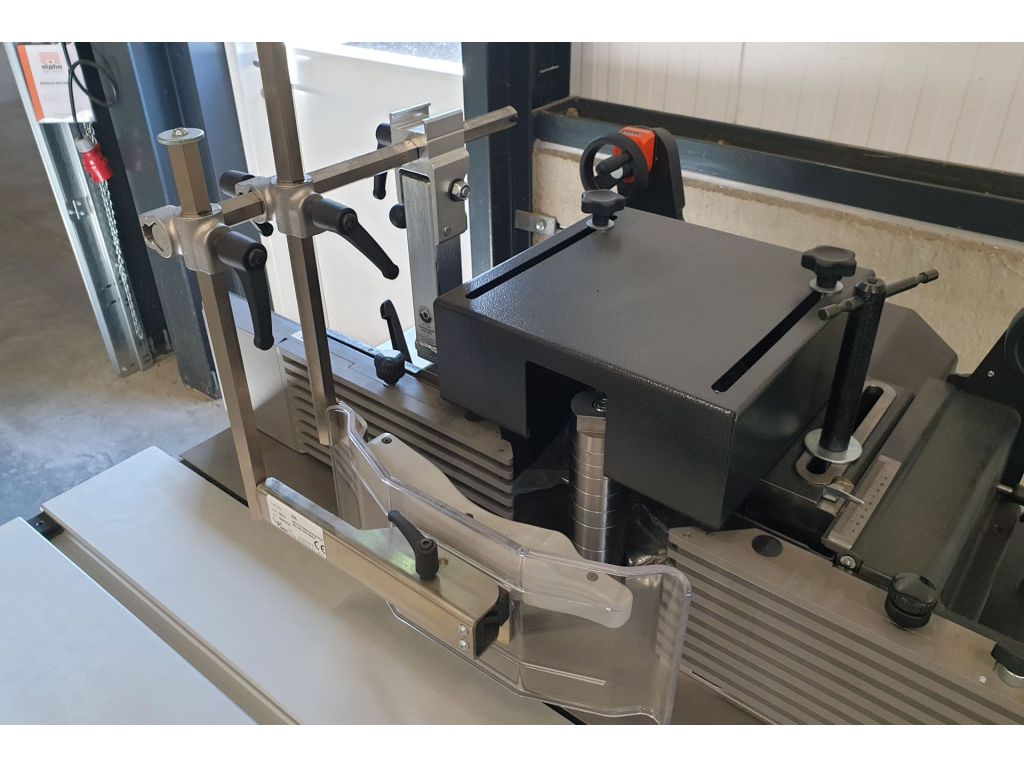 Верхнее ограждение с откидным фронтальным прижимом заготовки, направляющие линейки на входе и выходе со шкалой и микрометрическим винтом для точной установки.