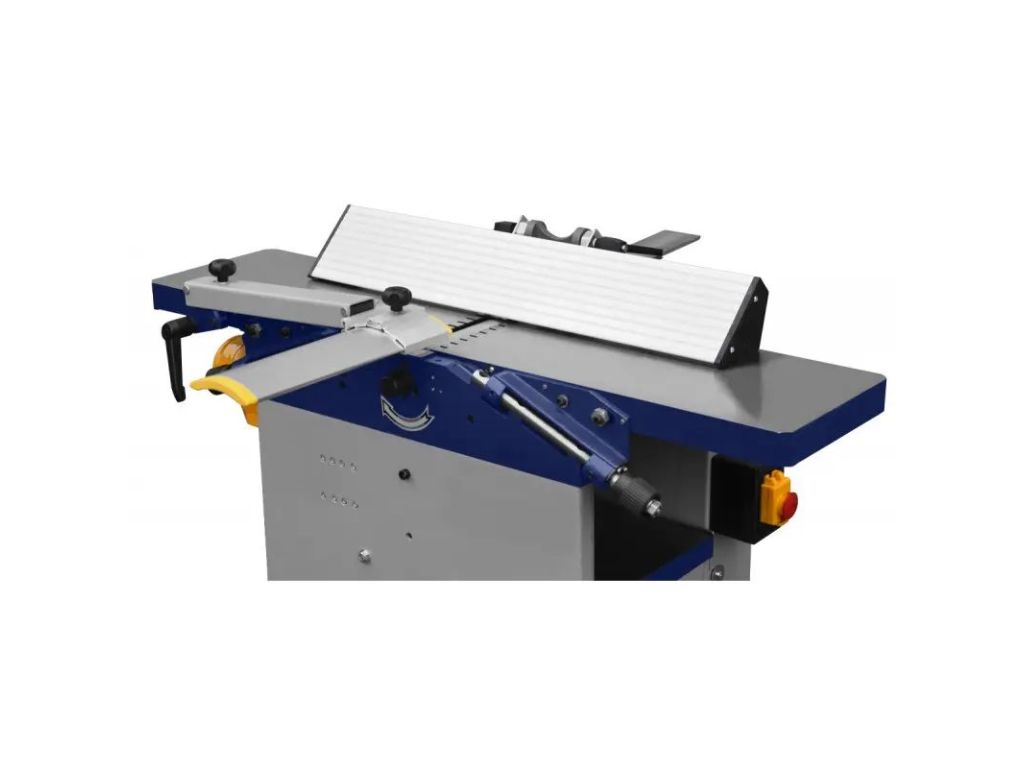 Ширина обработки составляет 254 мм. Глубина снятия за один проход – 2,5 мм фуганок и 3 мм рейсмус. Максимальная высота рейсмусования составляет 180 мм. Стальные ролики подачи расположены близко к ножам, что позволяет обрабатывать короткие заготовки. Для обработки под углом есть фуговальный упор с углом наклона 0-45°. Несмотря на компактный размер, этот фуговально-рейсмусовый станок 250 мм обладает промышленной мощностью, что делает его выгодным решением для профессиональных мастерских.