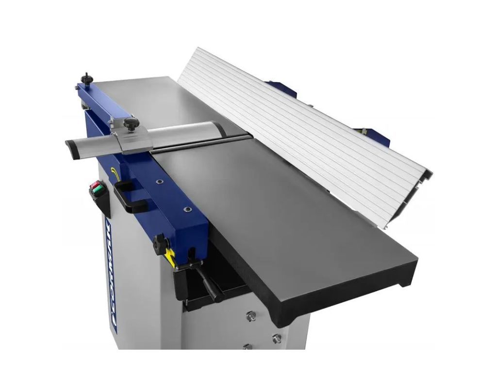 Высота рейсмусования составляет 180 мм. Максимальная глубина снятия за один проход – 4 мм на фуганке и 3 мм на рейсмусе. Чугунные столы со шлифованной поверхностью обеспечивают надежную поддержку и плавное скольжение заготовок. Фуговальный упор регулируется в диапазоне 90°-45°, что позволяет точно обрабатывать детали под разными углами. Благодаря жесткой чугунной конструкции весом 200 кг, этот фуганок рейсмус 300 мм сохраняет точность и стабильность при любых условиях.