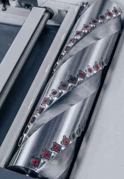 СПИРАЛЬНЫЙ НОЖЕВОЙ ВАЛ SOFT-FORCE (ОПЦИЯ!!!) Имеет 3 ряда твердосплавных пластин. Ножевые пластины расположены по спирали. Это обеспечивает плавный вход ножей в заготовку и исключает подрывы, что повышает качество обработанной поверхности. |