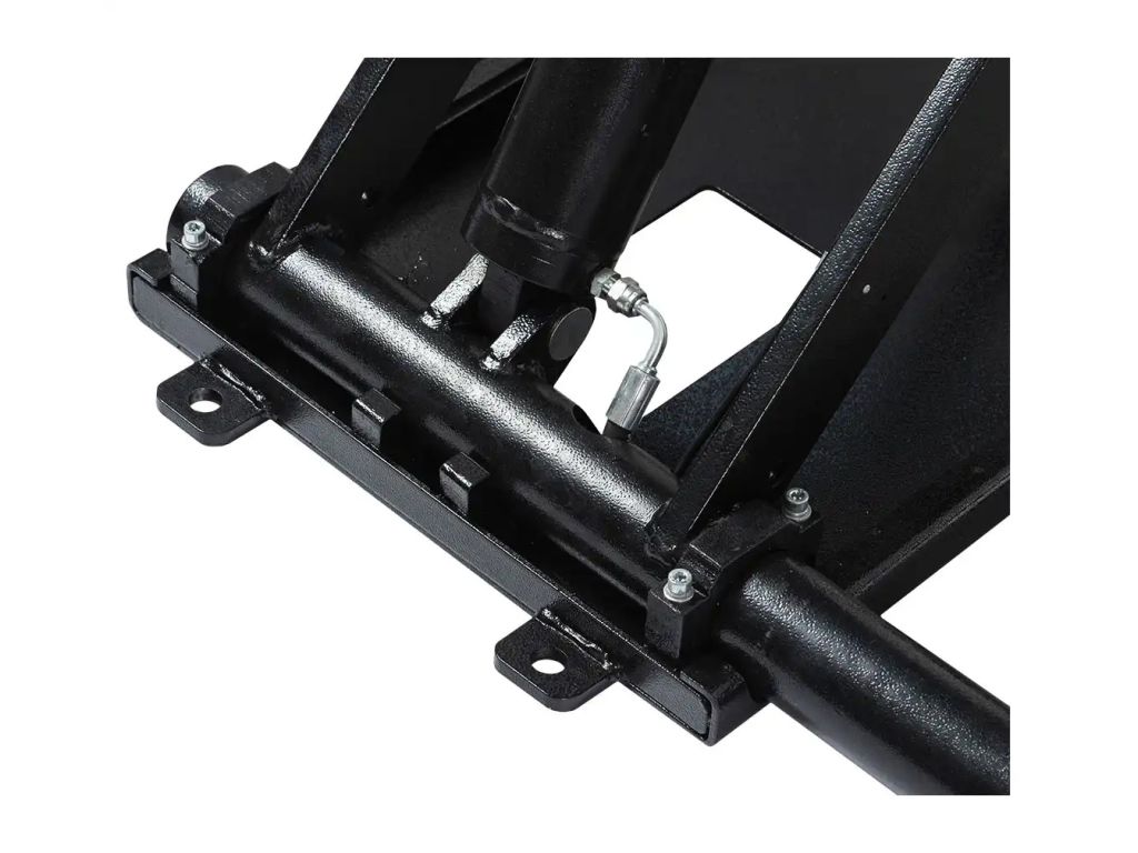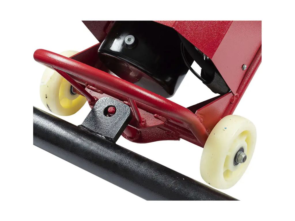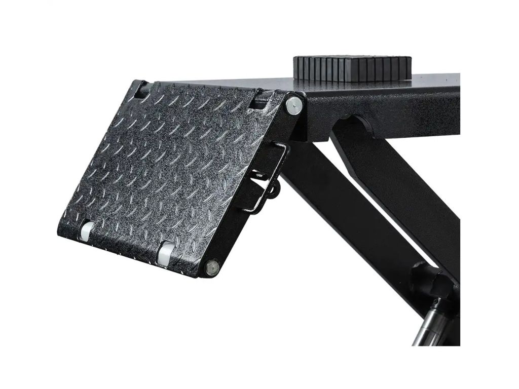 Гидравлический механизм обеспечивает плавное и контролируемое поднятие груза. Время подъема/опускания составляет 35 с. Пандусы с рифленой поверхностью упрощают заезд автомобиля на платформы. Длина платформ без пандусов – 1480 мм, с пандусами – 2080 мм. Этот компактный автомобильный подъемник в сложенном состоянии занимает мало места и оснащен колесами, что делает его удобным для хранения и перемещения.