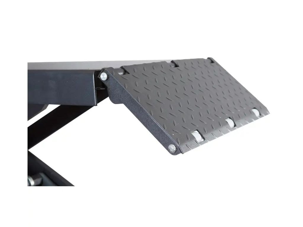 Для облегчения заезда автомобиля на платформу есть рифленые пандусы шириной 635 мм. Длина платформы без пандуса – 1450 мм, с пандусом – 2050 мм. В комплект поставки входят 4 резиновые накладки для защиты порогов авто и предотвращения его смещения при подъеме. Этот ножничный подъемник имеет простую панель управления с тремя кнопками (подъем, опускание, фиксация в выбранном положении), поэтому работать с ним очень удобно.