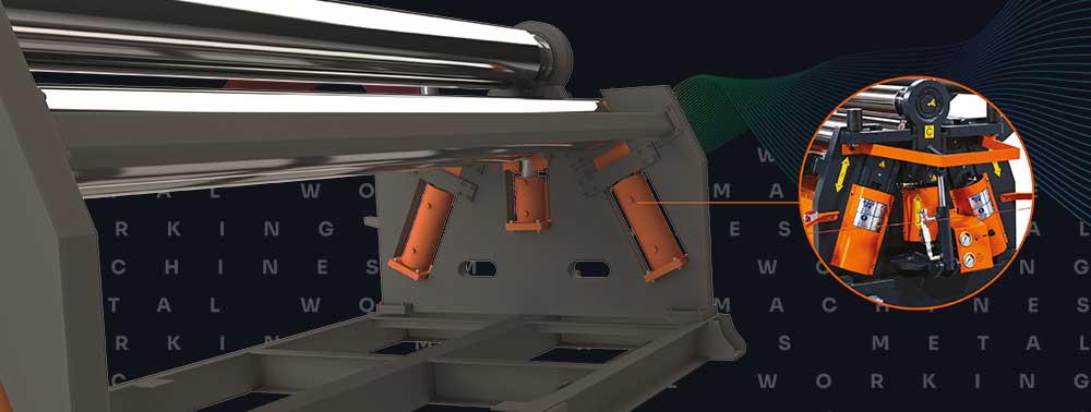 Боковые валки соединены с корпусом гидравлическими поршнями, которые перемещаются вверх и вниз по прямой линии. Благодаря системе линейных направляющих расстояние между верхним и нижним валками больше, чем при любой другой системе, что позволяет сгибать различные материалы с разной толщиной (сильная предварительная гибка и гибка тяжелых листов).