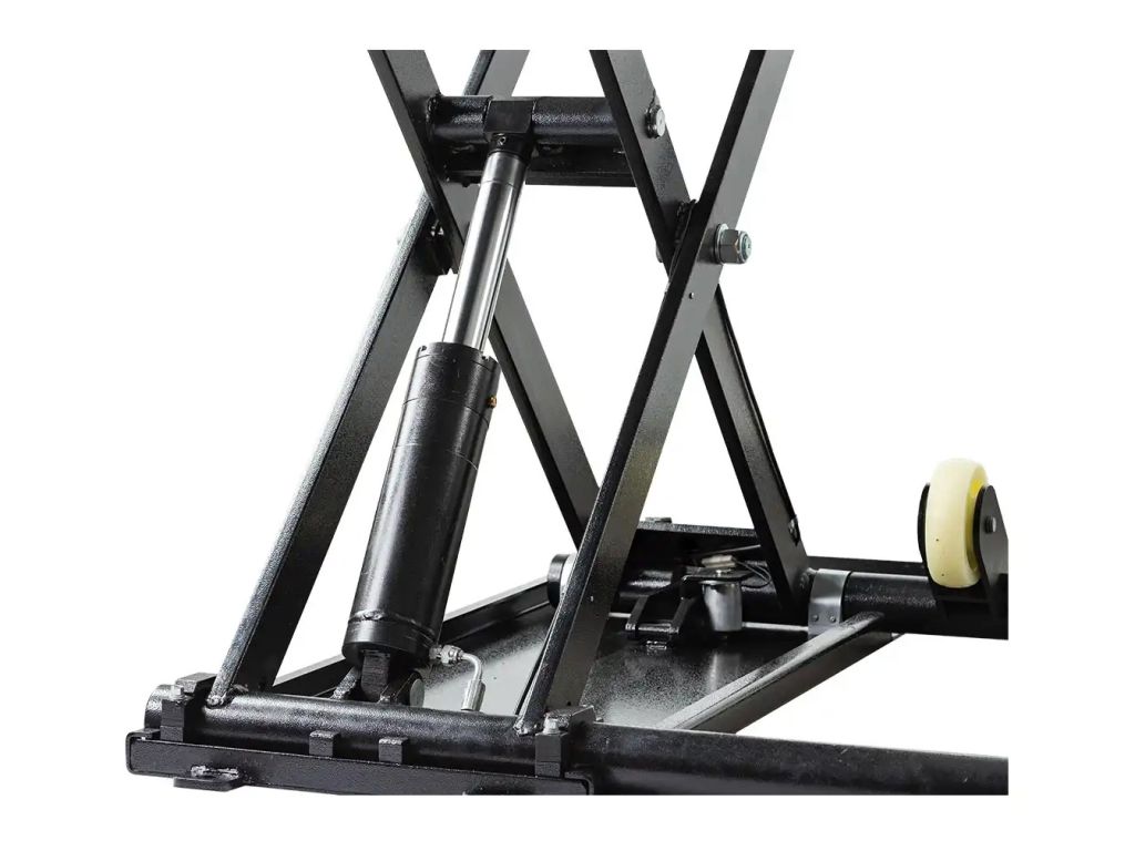 Гидравлический механизм обеспечивает плавное и контролируемое поднятие груза. Время подъема/опускания составляет 35 с. Пандусы с рифленой поверхностью упрощают заезд автомобиля на платформы. Длина платформ без пандусов – 1480 мм, с пандусами – 2080 мм. Этот компактный автомобильный подъемник в сложенном состоянии занимает мало места и оснащен колесами, что делает его удобным для хранения и перемещения.