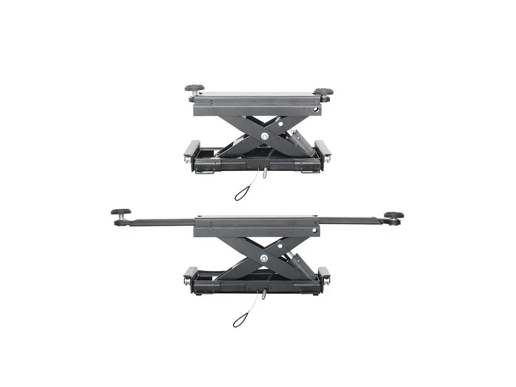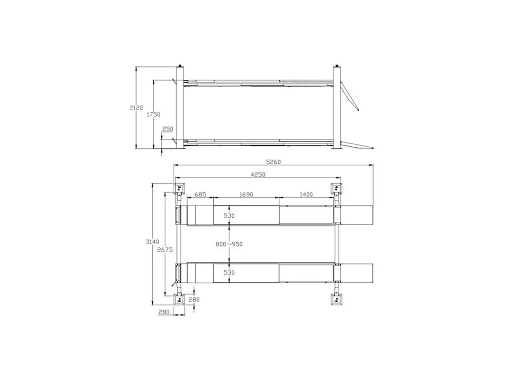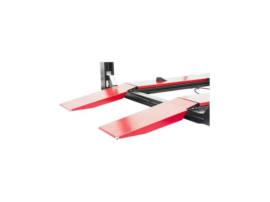 Диапазон подъема – 250-1750 мм, скорость подъема/опускания – около 50 с. Регулировка ширины рамп в диапазоне 800-950 мм позволяет адаптировать подъемник под разные колесные базы. Длина платформ 4250 мм дает возможность обслуживать длинные транспортные средства. Этот подъемник для развал-схождения имеет ручную разблокировку предохранительных стопоров, что повышает надежность конструкции и облегчает обслуживание.