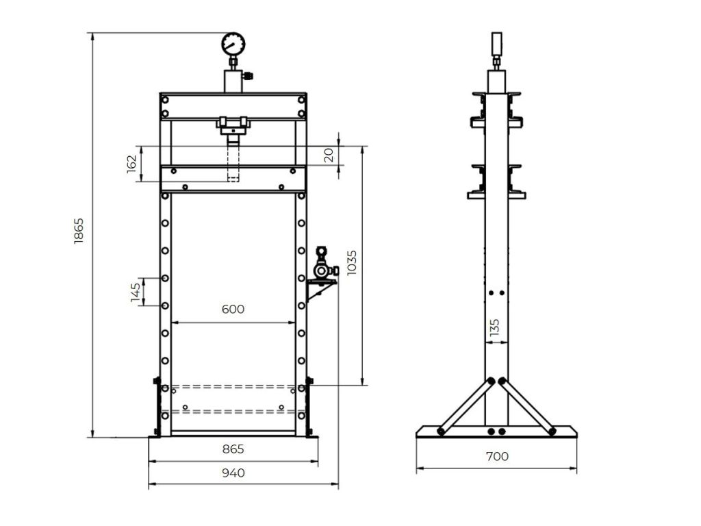 Расстояние между колоннами составляет 605 мм. Опорный стол регулируется по высоте в диапазоне 30-1045 мм, что позволяет точно настроить пресс под особенности заготовки и тип операции. Для контроля текущего усилия есть четкий манометр. Сварная рама изготовлена из высокопрочной стали и усилена ребрами жесткости, что делает этот гидравлический пресс 30 тонн устойчивым к высоким нагрузкам.