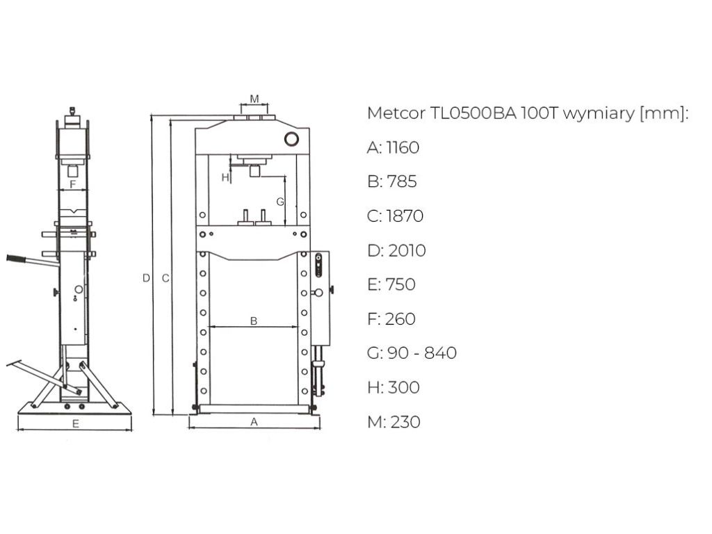 Пневматически-гидравлический пресс METCOR TL0500BA 100 т – это эффективное оборудование для запрессовки-выпрессовки, выравнивания, гибки, штамповки, рихтовки и формирования металлоконструкций на автосервисах, а также в ремонтных, монтажных и производственных мастерских. Благодаря усилию 100 тонн подходит для тяжелых промышленных задач, а ширина стола 785 мм и регулировка его высоты на 9 уровней в диапазоне 90-840 мм позволяют работать с заготовками разного размера.