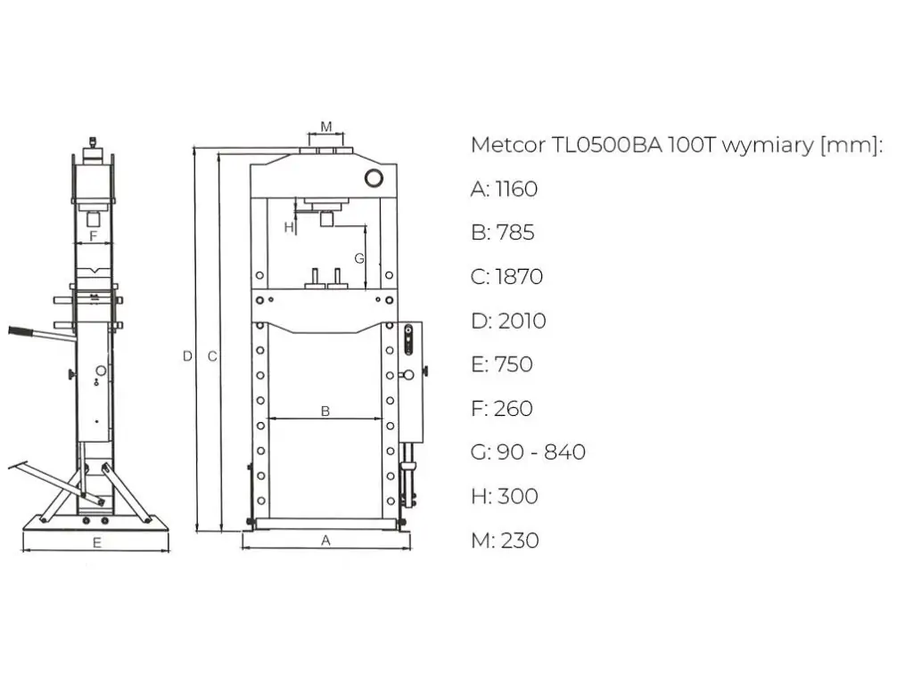Пневматически-гидравлический пресс METCOR TL0500BA 100 т – это эффективное оборудование для запрессовки-выпрессовки, выравнивания, гибки, штамповки, рихтовки и формирования металлоконструкций на автосервисах, а также в ремонтных, монтажных и производственных мастерских. Благодаря усилию 100 тонн подходит для тяжелых промышленных задач, а ширина стола 785 мм и регулировка его высоты на 9 уровней в диапазоне 90-840 мм позволяют работать с заготовками разного размера.
