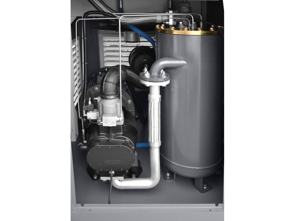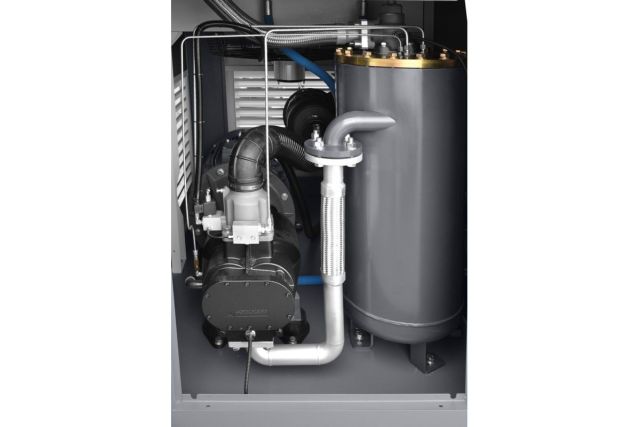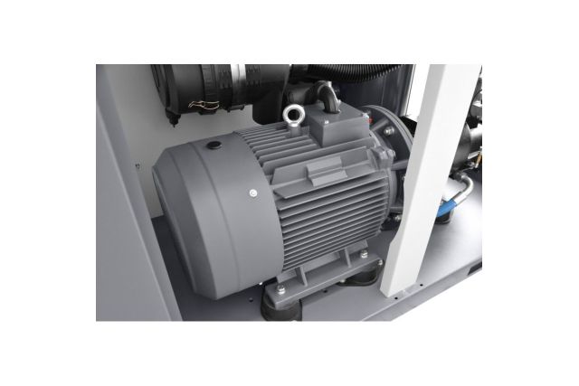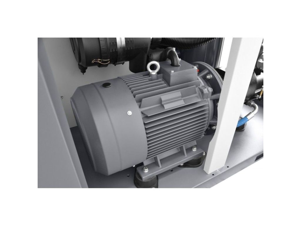 в компрессоре применено надежное и безопасное решение, представляющее собой прямую передачу привода между двигателем и винтовым механизмом (через так называемую кулачковую муфту), что обеспечивает: высокий эффективный КПД; более эффективное выравнивание вибрации; устранение необходимости в регулировке, которая возникает при традиционной ременной передаче;