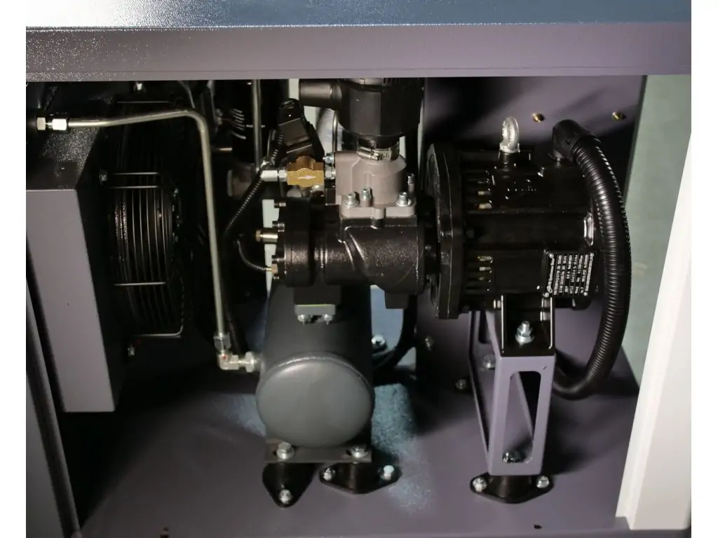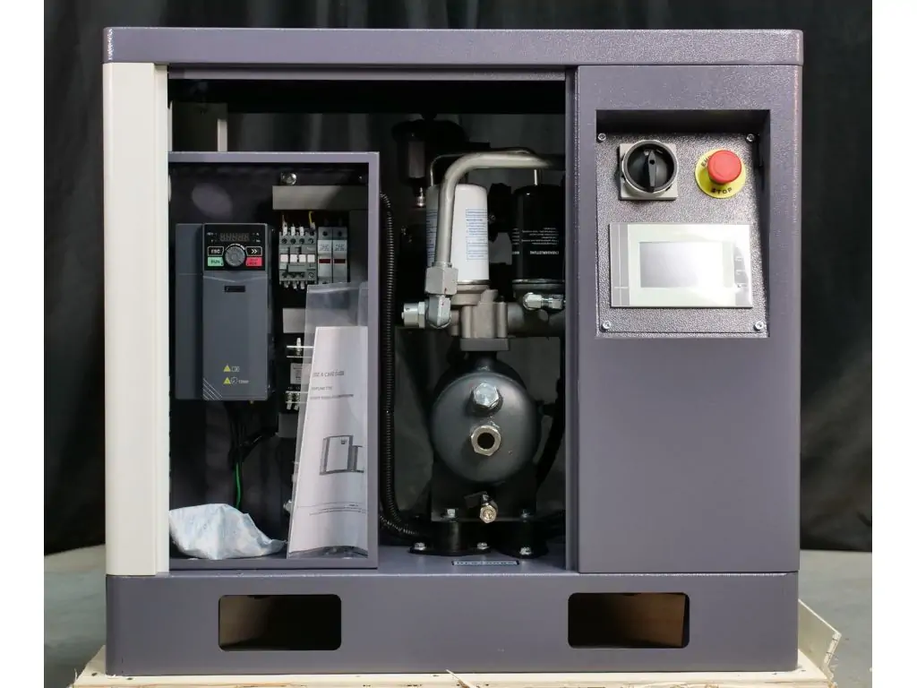 Еще одним преимуществом встроенного инвертора является регулировка оборотов двигателя в зависимости от текущей нагрузки, что позволяет экономить до 35% электроэнергии и увеличить рабочий ресурс компрессора. В сочетании с высокой удельной мощностью и более высоким КПД двигателя на постоянных магнитах, это делает оборудование чрезвычайно энергоэффективным и способствует быстрой окупаемости. Также этот винтовой компрессор 220 В с инвертором оснащен винтовым блоком Baosy и электронными компонентами марок CHINT и Schneider Electric, что гарантирует его надежную и длительную службу.