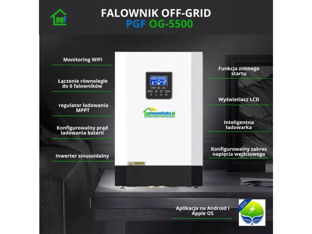 Солнечный фотоэлектрический инвертор OFF-GRID PGF OG-5500 MPPT 5.5KW + WiFi является многофункциональным инвертором и зарядным устройством, сочетающим в себе функции инвертора, солнечного зарядного устройства с ШИМ (широтно-импульсная модуляция) и зарядного устройства для аккумуляторов.