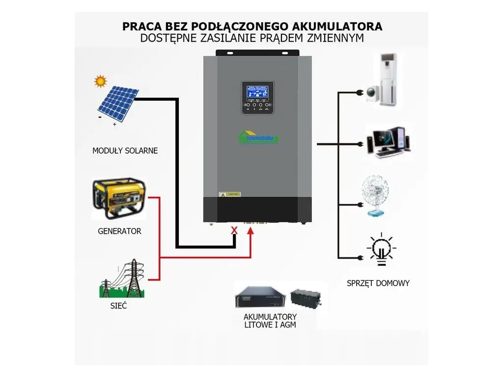 - Многофункциональность: работает как инвертор переменного тока и зарядное устройство постоянного тока, объединяет функции сетевого зарядного устройства 230 В и солнечного контроллера заряда