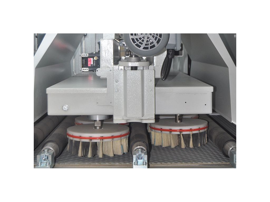 Позиционирование всех узлов (насколько глубоко щеточки погружаются в заготовки), рабочее направление шлифовальных щеток, скорость вращения шлифовальных щеток и положение конвейерного стола выполняются на сенсорной панели управления.