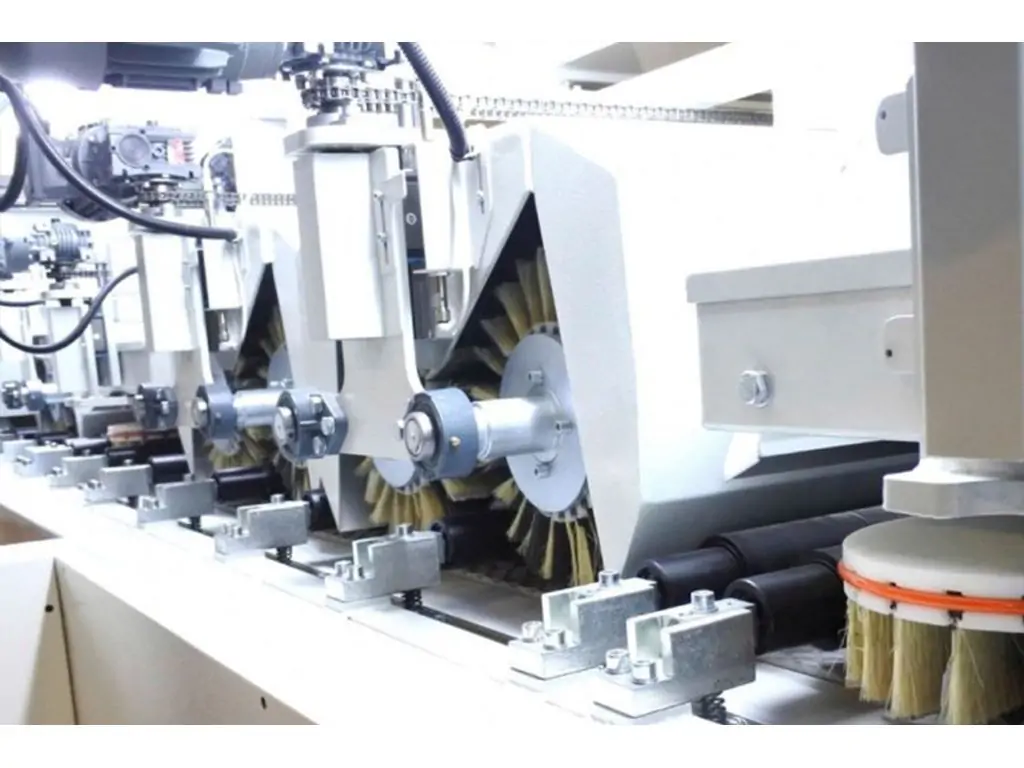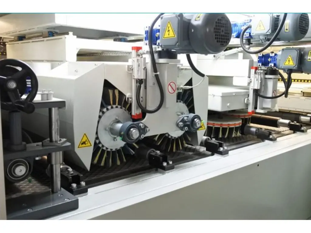 Этот агрегат состоит из 9 качающихся щеточных шлифовальных машин с автоматической регулировкой высоты, скорости и направления. Всего есть 2 единицы данной системы. Он чрезвычайно успешен при шлифовании на необработанных и грунтовочных изделиях. Легко заменяемые щетки обеспечивают удобство для оператора. Его способность вращаться с обеих сторон позволяет использовать различную зернистость на двух поверхностях автоматического щеточного шлифовального станка.