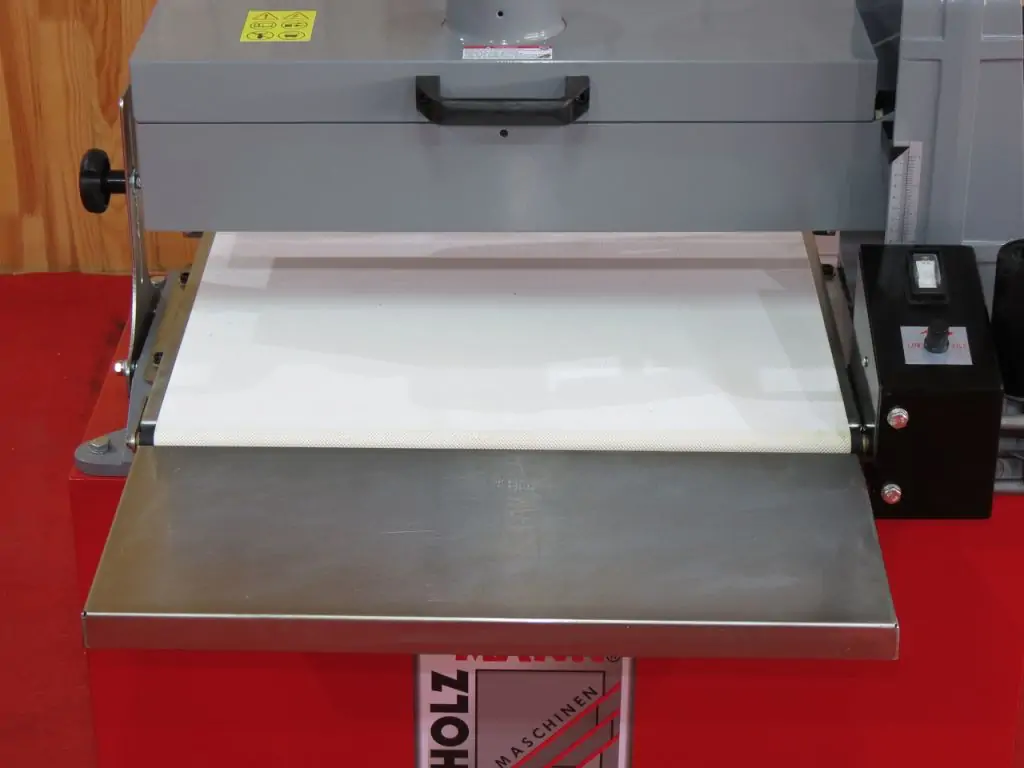 Заготовка кладется на ленточный транспортер, плавно подающий ее во вращающийся барабан. Абразивная лента на барабане снимает тонкий слой материала, выравнивая поверхность. Толщина снятия зависит от настроек высоты и зернистости абразива.