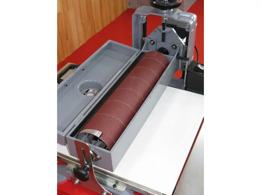 Станок оснащен асинхронным двигателем мощностью 1,5 кВт, рассчитанным на длительные нагрузки. Подача заготовки автоматическая, с плавной регулировкой скорости в диапазоне 0-3 м/мин. Стол имеет удлинители с обеих сторон, что позволяет удобно работать с большими и длинными заготовками. Пружинный натяжной механизм ленты обеспечивает стабильное натяжение и точное шлифование. Благодаря жесткой чугунной конструкции, этот деревообрабатывающий барабанный шлифовальный станок сохраняет точность и стабильность даже при высоких нагрузках.