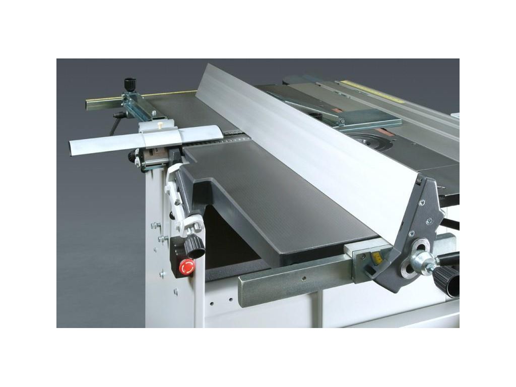 Все станки оснащены фронтальным столом с поддерживающей телескопической опорой и поперечной упорной линейкой с 2-мя откидными упорами. Это позволяет обрабатывать на станке листовые материалы, также возможно увеличение длинны каретки до 2050 мм.