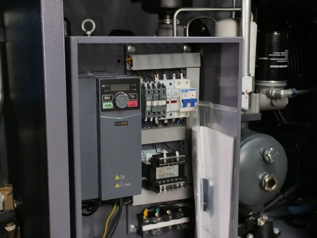 Весомыми преимуществами представленной комбисистемы являются двигатель на постоянных магнитах, который обеспечивает высокую удельную мощность и более высокий КПД, и инверторное управление, позволяющее регулировать обороты двигателя и обеспечивающее его плавный пуск. Винтовой блок Baosy и электронные компоненты марок CHINT и Schneider Electric делают этот винтовой компрессор с осушителем и ресивером надежным и безотказным, а сенсорная панель MAM-6070MSD обеспечивает легкое управление и максимальный контроль над его работой. Благодаря компактному размеру и тихой работе, такую комбисистему можно удобно установить в рабочем помещении без дискомфорта для персонала. Все компоненты идеально подобраны по мощности и производительности и готовы к работе без необходимости дополнительного монтажа соединений и трубопроводов.