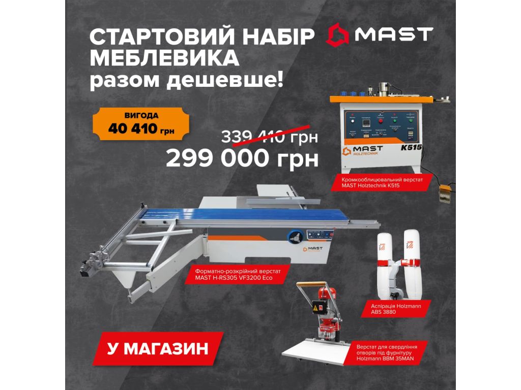 В комплект входят 3 базовых станка (форматно-раскроечный, кромкооблицовочный и для сверления отверстий под фурнитуру), а также аспирационная установка для удаления древесной пыли и стружки. На все оборудование предоставляется гарантия 12 месяцев, а наши специалисты по договоренности помогут настроить и запустить оборудование, выехав к вам для проведения пусконаладочных работ. Доставка по всей территории Украины транспортными компаниями. При необходимости оказываем сервисное обслуживание и информационную поддержку. Поэтому, если вы ищете, где купить надежное оборудование для производства мебели в Украине, заказывайте комплект "Начни производство" на KMA.UA.