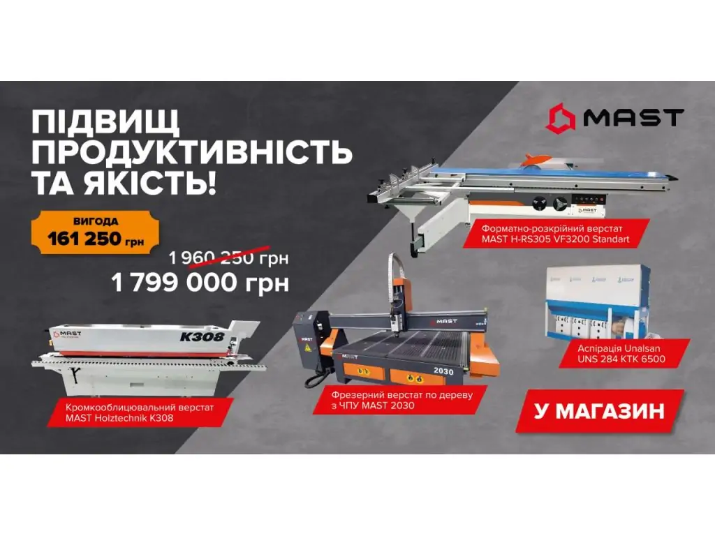 Если ваш мебельный бизнес давно и успешно работает, но хочется увеличить оборот и выйти на новый уровень, у нас есть отличное предложение - комплект "Увеличь производительность и качество", который включает в себя 3 мега функциональных станка (форматно-раскроечный, фрезерный с ЧПУ и автоматический 7-операционный кромкооблицовочный) и мощную аспирационную установку для удаления древесных отходов.