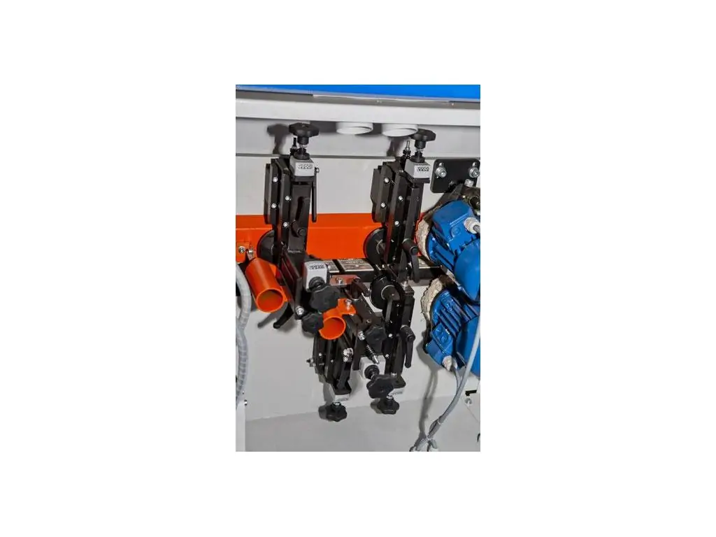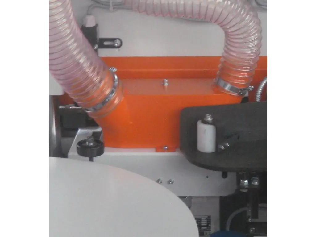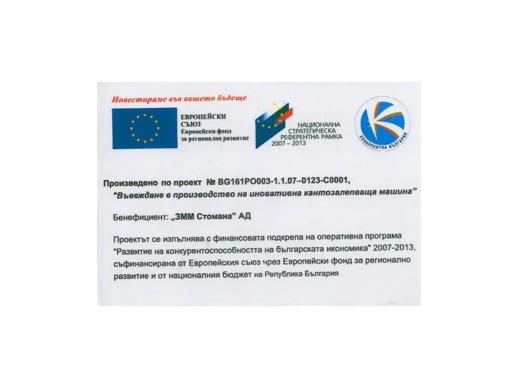 Станок для склеивания кантов односторонняя – правостороннего изготовления. Кантовый ригель - до ø600 мм. Приклеивающая часть с гранулированным расплав клеем. Бак для клея под расплавляющим роликом. Нанесение клея посредством приклеивающего ролика в том же направлении, что и движение детали, не требующее настройки в зависимости от толщины материала. Электронное регулирование температуры клея. Автоматическое снижение температуры клея в случае приостановления работы. Гильотина для предварительного разрезания профилей PVC / ABS кантов – max.3x45. Зона прижима: трех ролик – большая принудительно приводится в движение – прижим с пружинный. Узел для вертикальная торцовки с двух HF двигателя – 200Hz, 12000rpm. Двух циркулярных дисках с размерами ø110 х ø32, Z=20 зуба. Узел для верхнего и нижнего снятия свесов с вертикальной и горизонтальной настройкой с двух HF двигателя 200 Hz, , ~12000 rpm. Фрезерные головки – Ø75; Z = 4; 15°, R2 или R3 /спецзаказ /. Узел обкатки углов с один HF двигатель – 200Hz, 12000rpm. Алмазная фрезерная головка - PCD CUTTER D68/61x d16 x 7 Z=4 R2 или R3 /спецзаказ /. Узел фрезерования на входе – двух HF двигателей – 1.1кW и 0.75 kW, 12 000 min-1. Алмазные фрезерные головки – PCD CUTTER D.60 x d20 x 48 Z 3+3. Узел циклования кромка, R2 или R3 /спецзаказ /. Узел циклования клея. Узел полирования – двух двигателей, двух полировальные диски 2хø125mm, 2x0.18kW, 2800min-1.Центрально регулирующийся вручную верхний прижим. Транспортная система с цепью. Несущие пластинки шириной 73 мм. Прижимающие ролики изготовлены из резины с диаметров 70 мм, установлены на подшипнике. Опорная балка с ролики – неподвижная. Пульт управления в передней части машины. Температура окружающей среды + 18° max + 35°C.