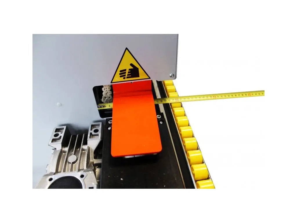 ПОДАЮЩИЙ КОНВЕЙЕР Деталь подается цепным конвейером с обрезиненными накладками. Ширина накладок 73 мм. Привод-мотор-редуктор 2,2 кВт VARVEL.