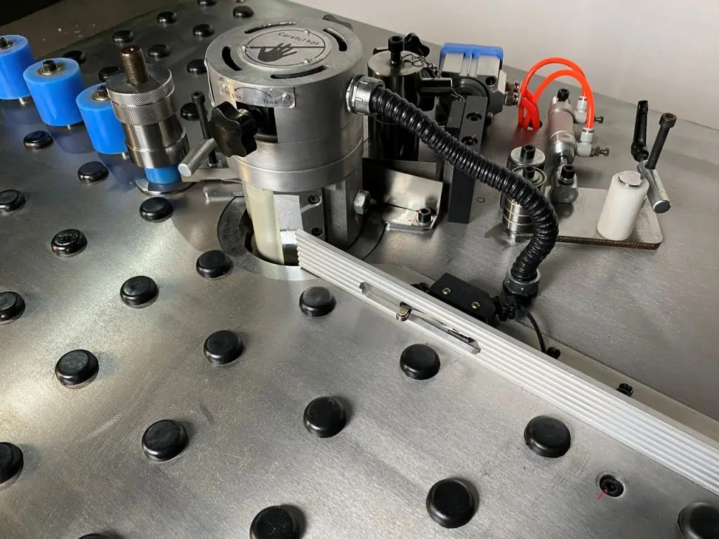 Оснащен двумя валами, один из которых наносит клей на кромочный материал, а другой – на поверхность заготовки, что обеспечивает надежное и аккуратное приклеивание. Благодаря продуманному строению направляющей рабочего стола, исключена возможность повреждения лицевой поверхности заготовки при перемещении.