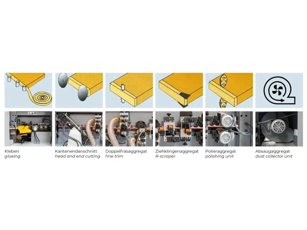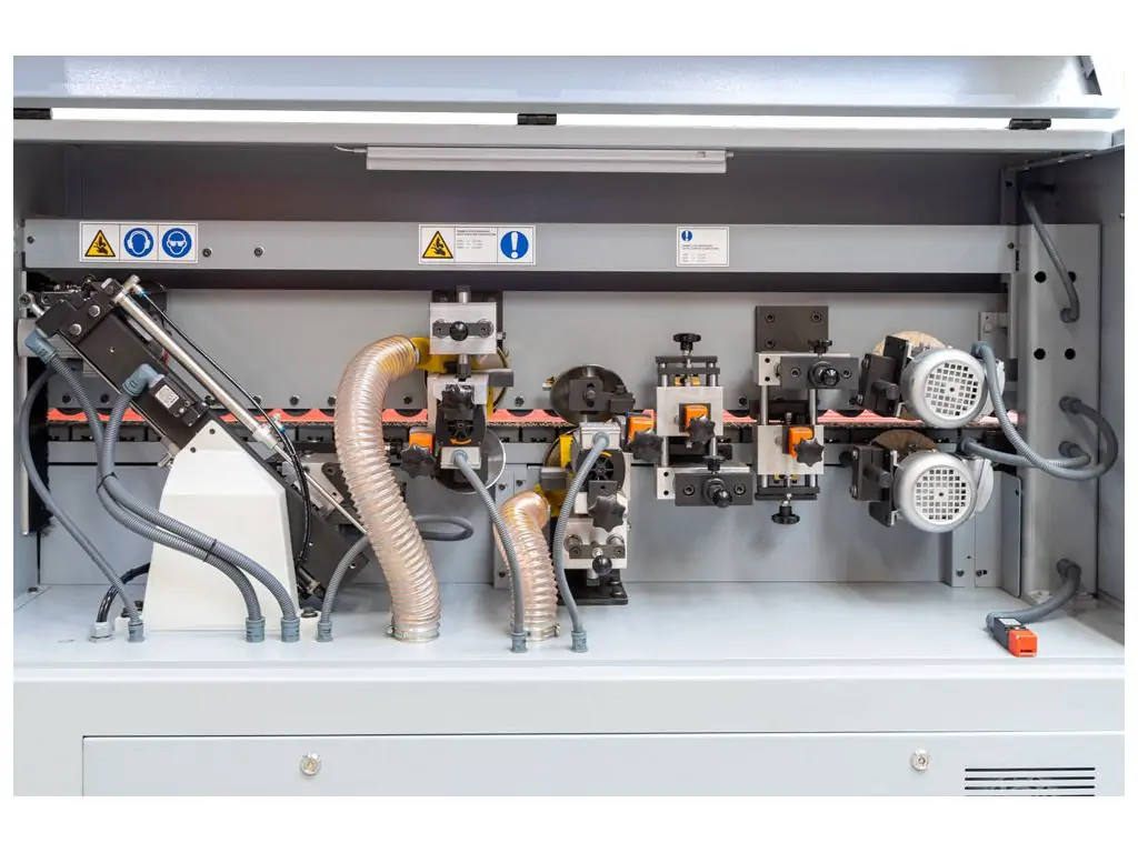 Клеевой вал со специальной поверхностью обеспечивает равномерное нанесение клея. Температуру клея можно настроить с сенсорного дисплея. Прорезиненные прижимные ролики с автоматической настройкой прижима обеспечивают точное и качественное соединение кромки с заготовкой. Массивная, жесткая станина гасит вибрации и поддерживает стабильность обработки. Дополнительным преимуществом модели является интегрированная вытяжная система, благодаря которой этот станок кромкоклеющий имеет чистую, беспылевую работу.