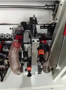 Этот узел выравнивает заготовку по вертикали, убирает ступеньку от подрезки и мелкие сколы на ламинации материала. Благодаря этому клей ложится равномерно, кромка держится крепче, а шов становится незаметным.