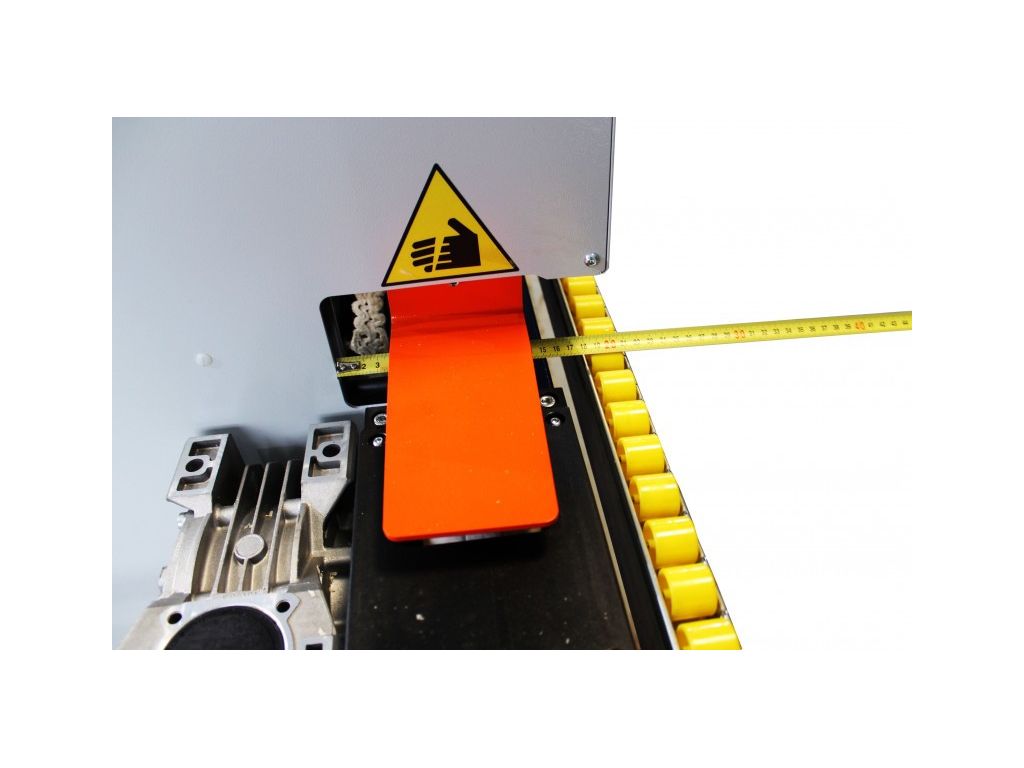 ПОДАЮЩИЙ КОНВЕЙЕР Деталь подается цепным конвейером с обрезиненными накладками. Ширина накладок 73 мм. Привод-мотор-редуктор 2,2 кВт VARVEL.