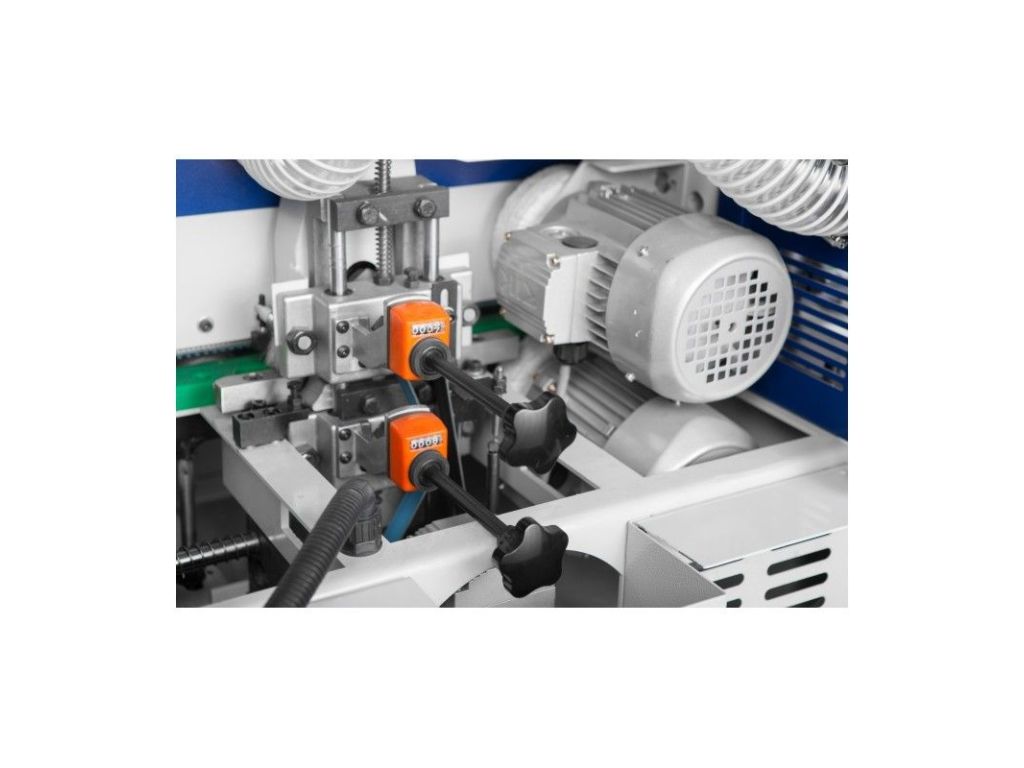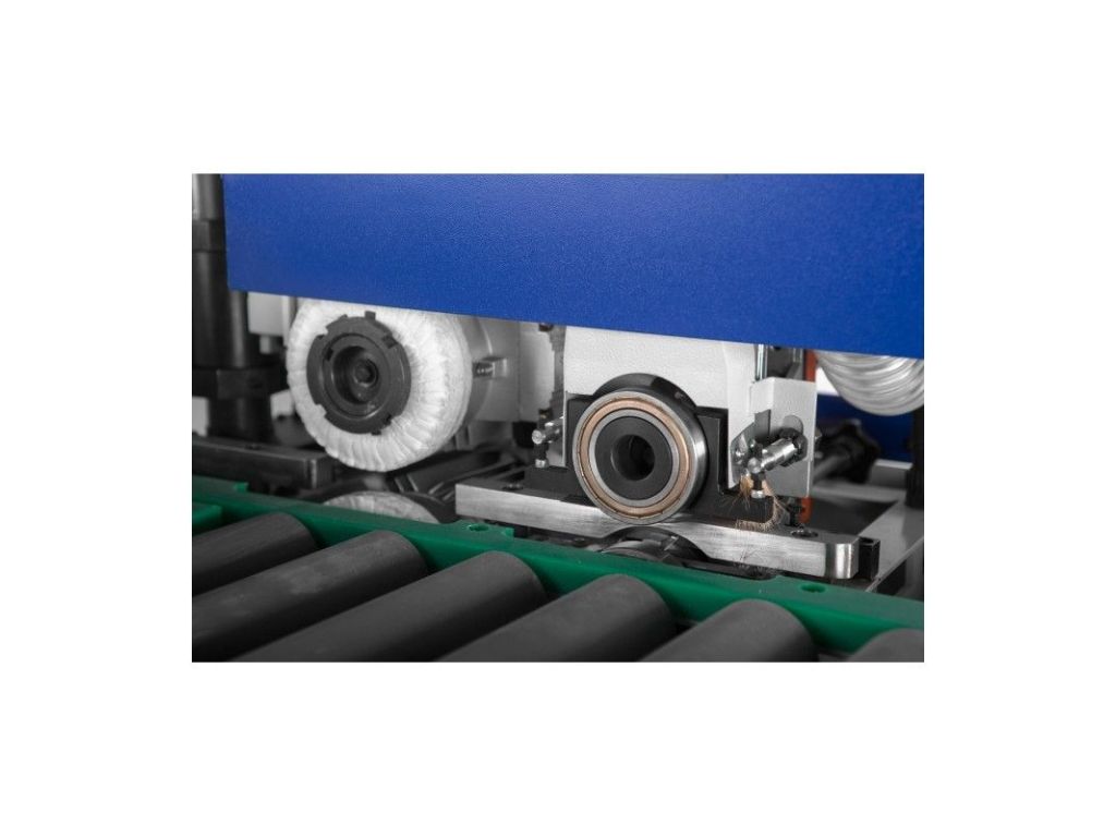 Фрезерный узел оснащен двумя радиусными фрезами R2 и плавающими копирами, позволяющими отслеживать толщину заготовки, что обеспечивает отличное качество обрабатываемой поверхности. Узел полирования устраняет шероховатость после фрезерования и придает обработанной кромке блеск.