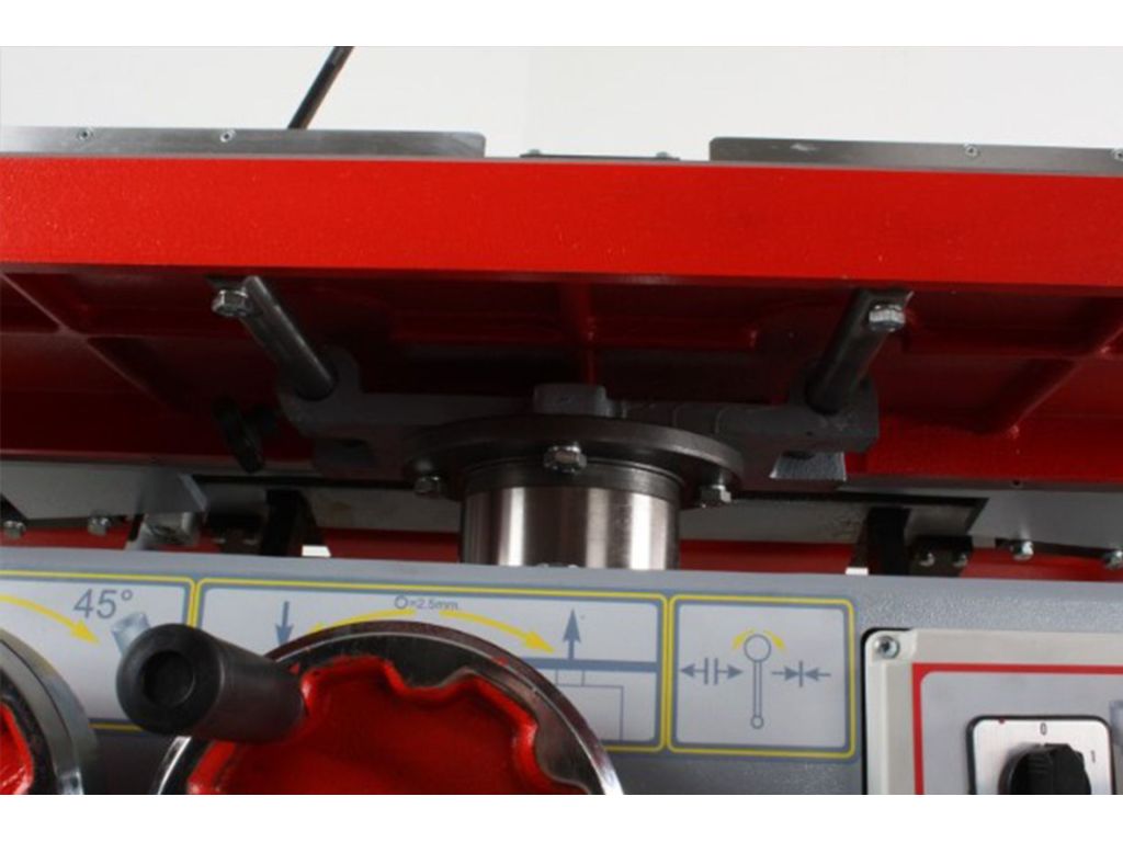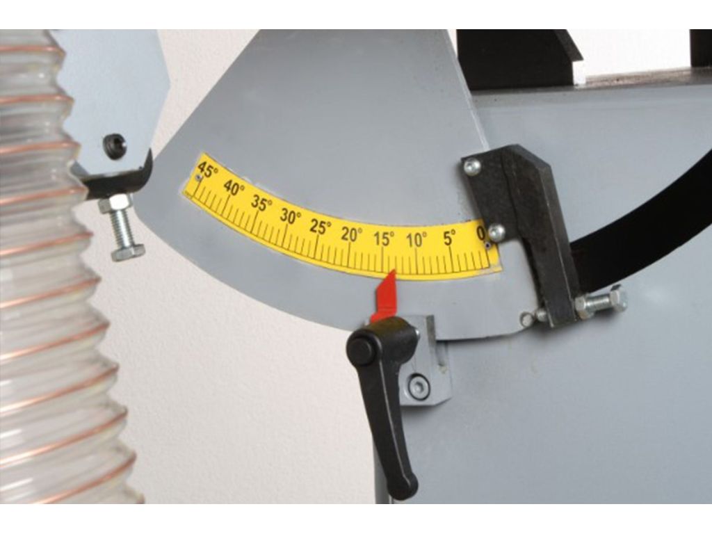 - Бесступенчатое регулирование угла наклона шлифовального агрегата с помощью маховика в диапазоне от вертикального положения до 45°.