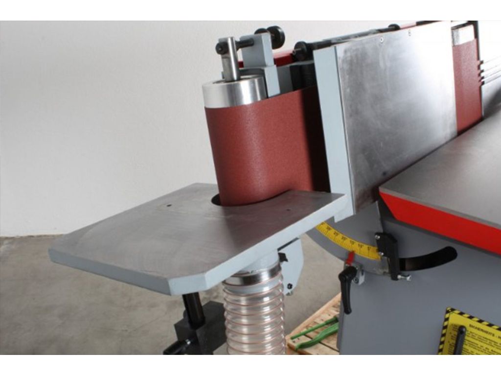 Комплект поставки: шлифовальная лента, приспособление для шлифования шпона, скошенный упор, стол для круглого шлифования, выдвижной расширитель стола.