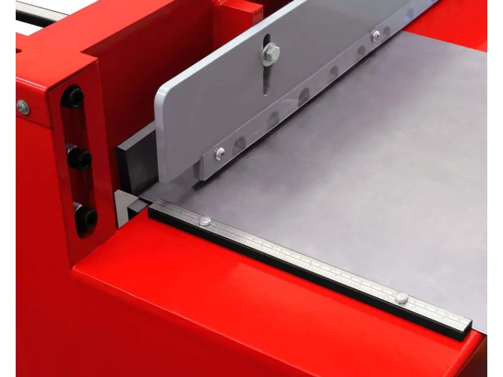 Фиксация листов производится с помощью автоматического прижимного устройства, задний упор помогает точно позиционировать заготовку. Есть ограничитель глубины подачи до 900 мм с миллиметровой шкалой. Конструкция обладает высокой жесткостью и прочностью, что позволяет работать с максимальной точностью и гарантирует большой рабочий ресурс оборудования. Модель прошла сертификацию по стандартам CE. Такой механический гильотинный резак будет эффективен для небольших мастерских и производств.
