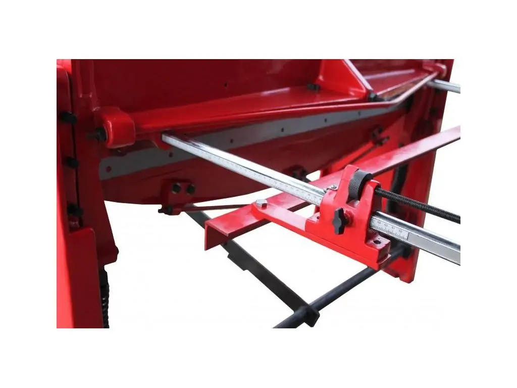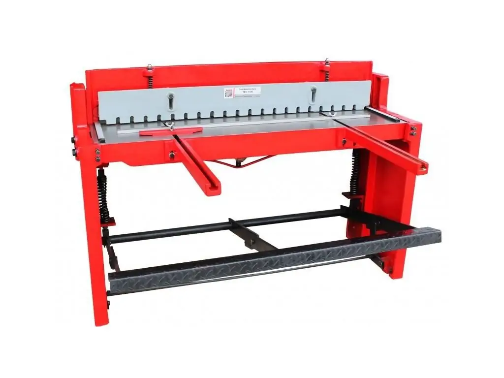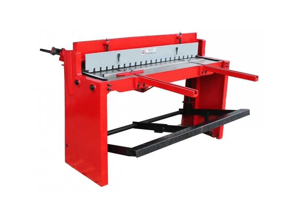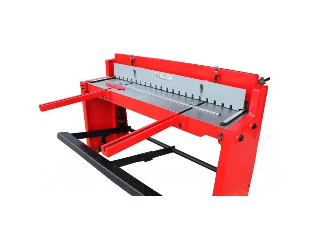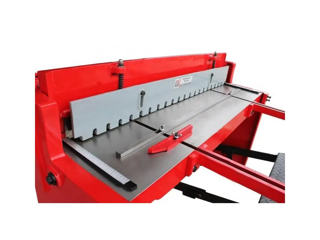 Ход режущего ножа под углом около 5º. Этим достигается плавность реза и снижение усилий, необходимых для осуществления раскроя. Автоматическое эффективное прижимное устройство для фиксации листового металла перед резкой. Движение режущей балки происходит за счет педального механизма. Подъем режущей балки производится пружинами. Простота конструкции обеспечивает долговечность станка.