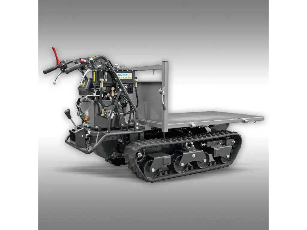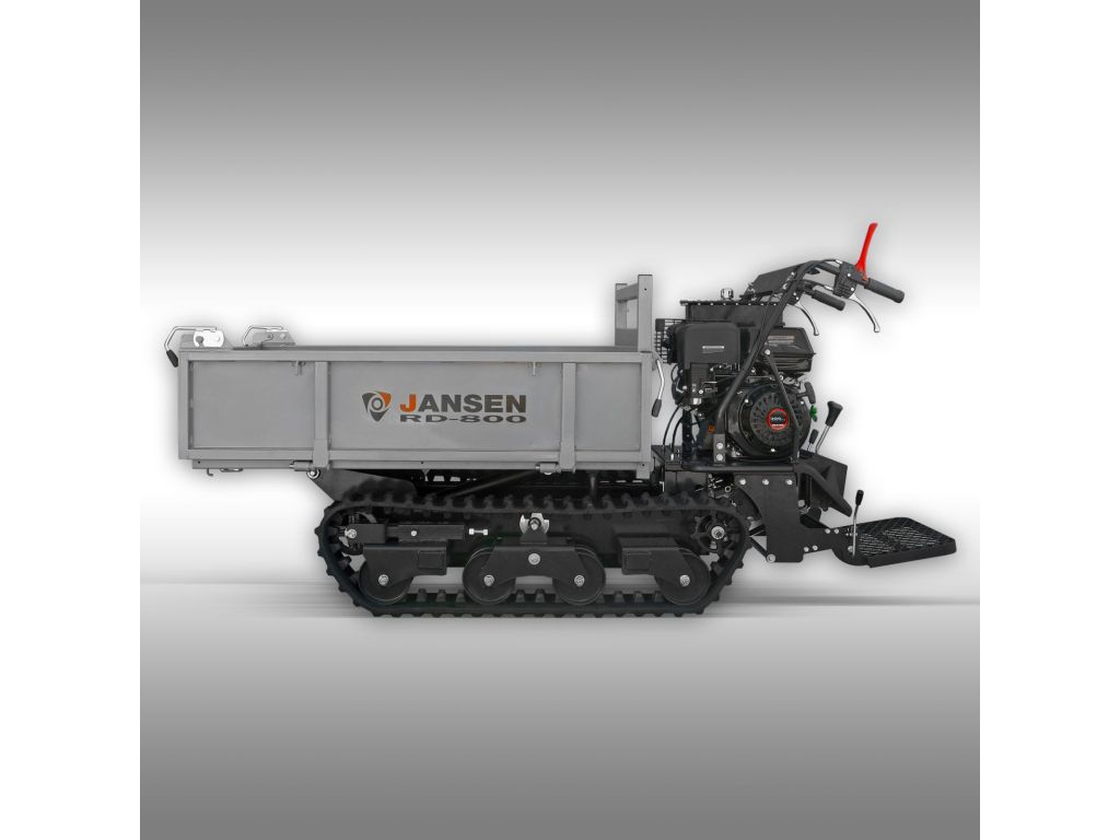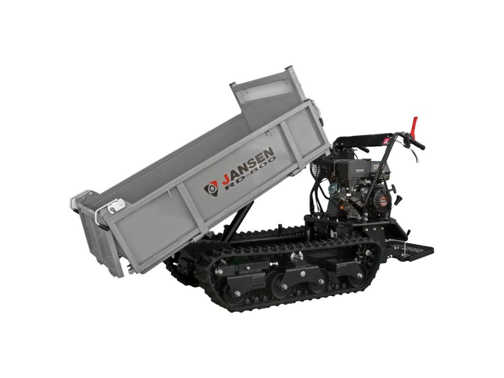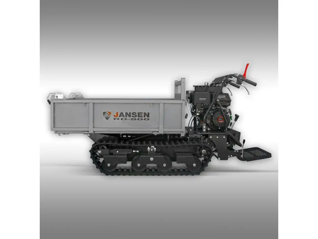 Гусеничный мини-самосвал Jansen RD-800 с общей грузоподъемностью 800 кг может эффективно применяться в различных сферах. Благодаря бензиновому двигателю с реверсивным пуском мощностью 13 л.с. он легко справится с интенсивными нагрузками, а мощная гидравлическая система значительно упрощает работу с большими грузами.