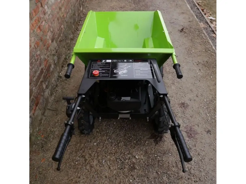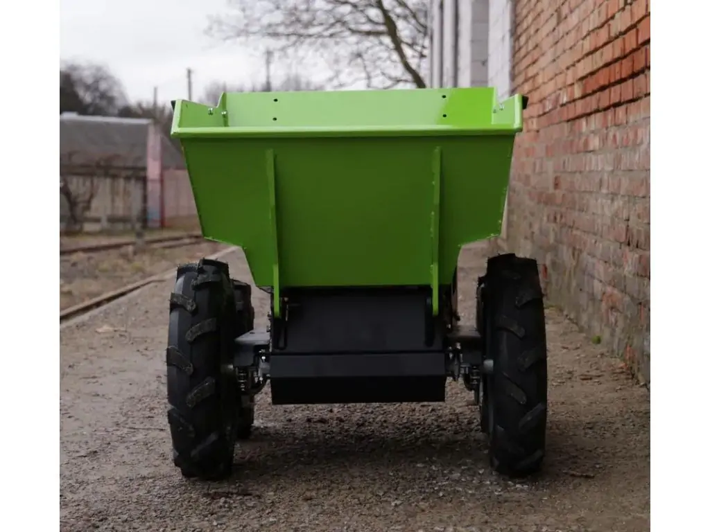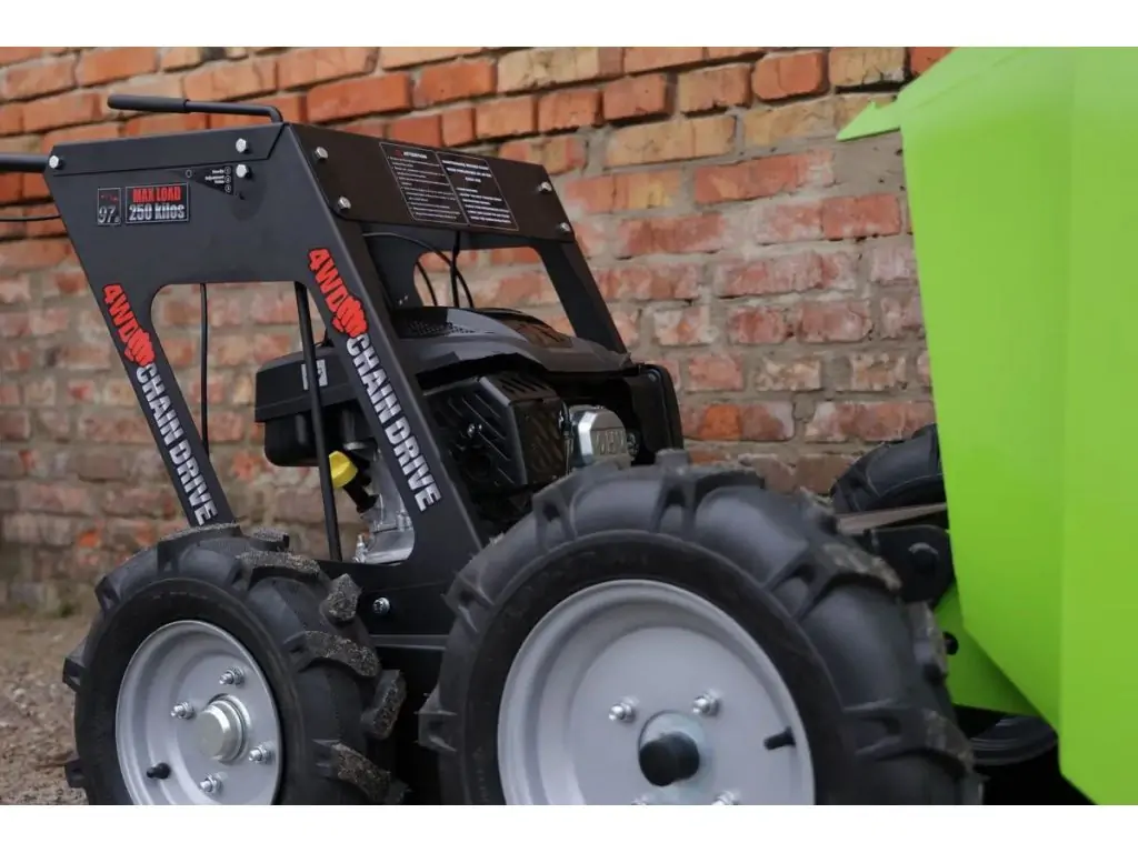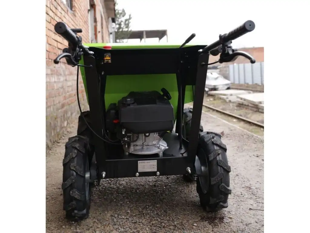 Оснащен бензиновым двигателем мощностью 3,8 кВт. Большие колеса с протекторами и колесный привод 4х4 обеспечивают передвижение по любой поверхности. Есть 4 скорости вперед, 1 нейтральная и 1 назад. Рабочая скорость – 3,78 км/ч. Для легкой выгрузки кузов откидывается вперед с помощью рычага на правой ручке. Управление этим мини-самосвалом простое, интуитивно понятное и не требует применения большой физической силы.