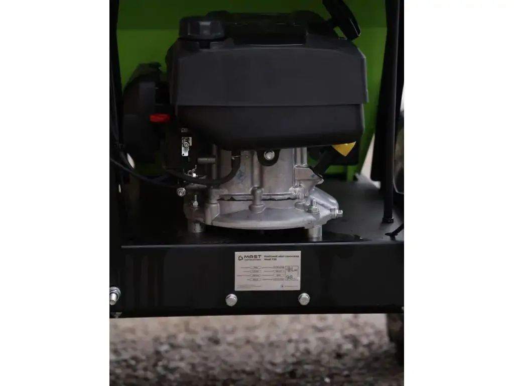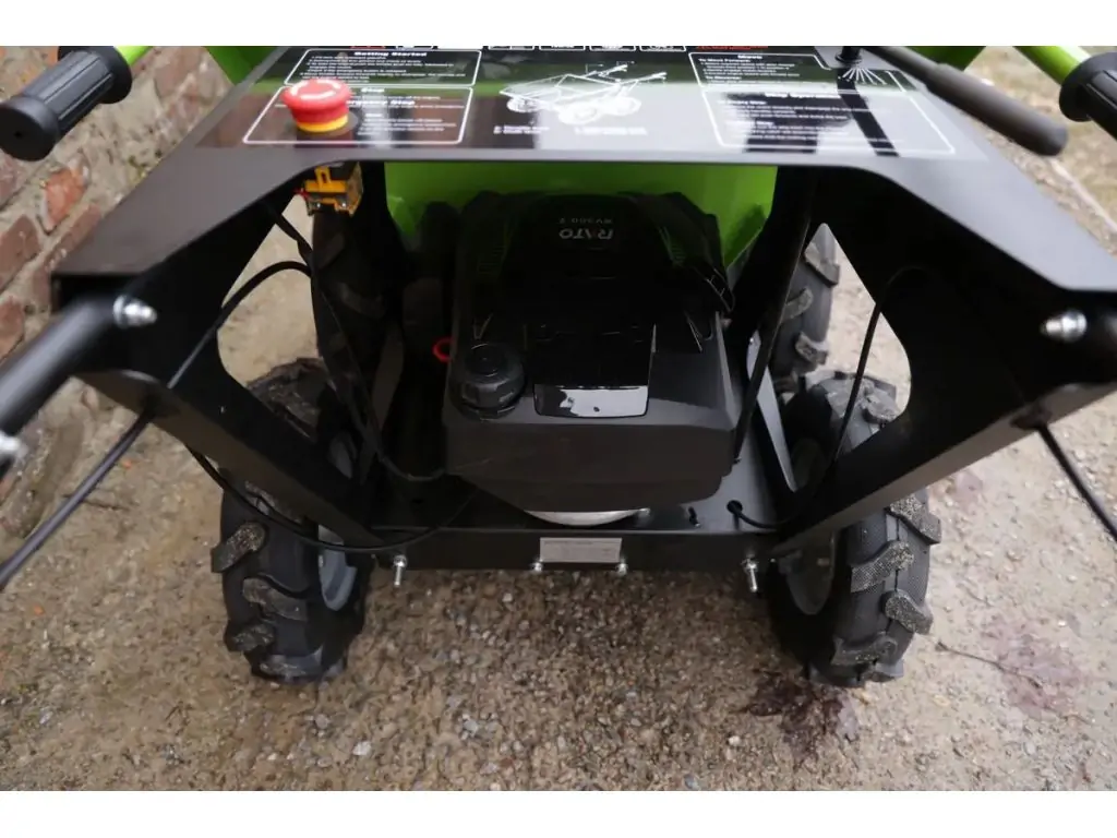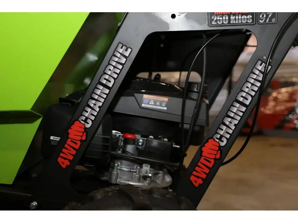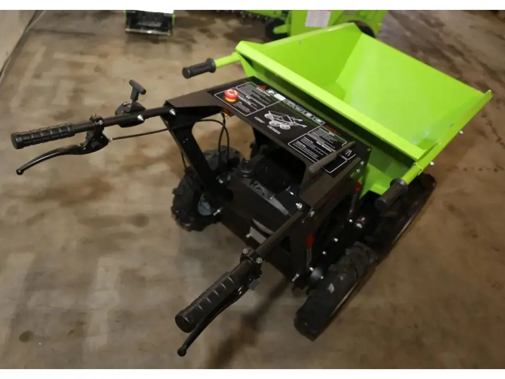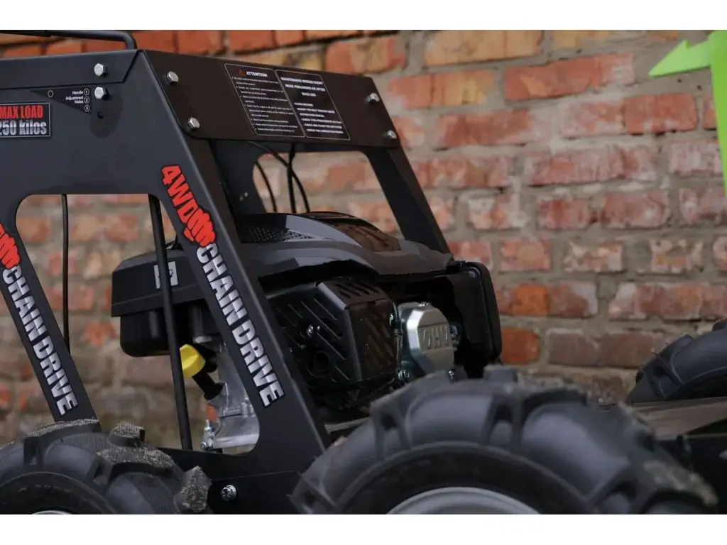 Оснащен бензиновым двигателем мощностью 3,8 кВт. Большие колеса с протекторами и колесный привод 4х4 обеспечивают передвижение по любой поверхности. Есть 4 скорости вперед, 1 нейтральная и 1 назад. Рабочая скорость – 3,78 км/ч. Для легкой выгрузки кузов откидывается вперед с помощью рычага на правой ручке. Управление этим мини-самосвалом простое, интуитивно понятное и не требует применения большой физической силы.