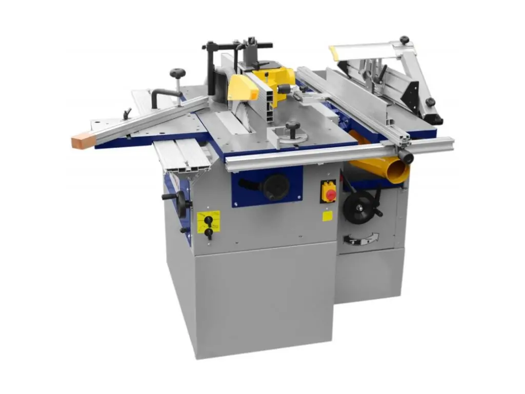 Мощность двигателя фуговально-рейсмусового блока составляет 2 кВт, фрезерного модуля – 1,4 кВт, циркулярно-торцовочной пилы – 1,1 кВт. Ширина обработки на фуганке и рейсмусе – 250 мм, максимальная высота пропила (при 90°) – 70 мм, максимальная высота фрезерования – 100-120 мм для профильных фрез. Жесткая станина из качественных материалов и вес 290 кг делают этот комбинированный станок для столярной мастерской точным, надежным и долговечным.
