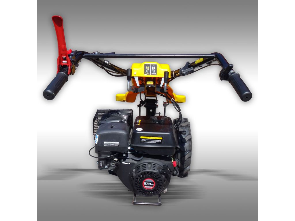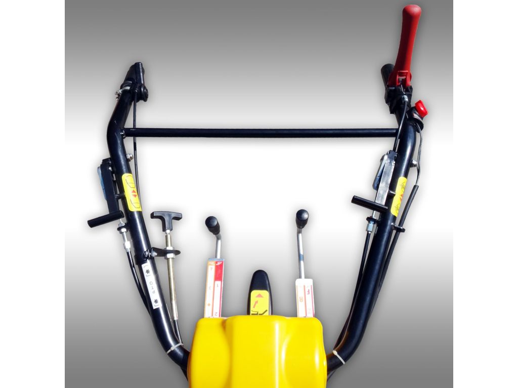 Ручку с элементами управления можно повернуть на 180 градусов, чтобы устройство можно было установить спереди или сзади. Мотоблок имеет 4 передачи переднего и 3 заднего хода (возможно реверс – в зависимости от положения руля). Опционально можно включить блокировку дифференциала (можно выдернуть через кулачковую муфту). Привод навесного оборудования: карданный вал (можно отключить)